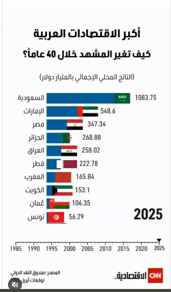 على مدار ال 40 عاماً، حافظت المملكة العربية السعودية على الصدارة بين قائمة أكبر الاقتصادات العربية بناتج محلي إجمالي قُدر بأكثر من 1083.75 مليار دولار في العام الجاري 2025 على حسب المصدر صندوق النقد الدولي، وهذه الصدارة لم تأتي من فراغ، فنحن نتكلم عن دولة نفطية ضخمة واستثمارات فيها بمليارات الدولة ضمن رؤية قطر 2030، إضافة إلى بنى تحتية ومشاريع طاقة متجددة ساهمت في زيادة الدخل القومي السعودي.