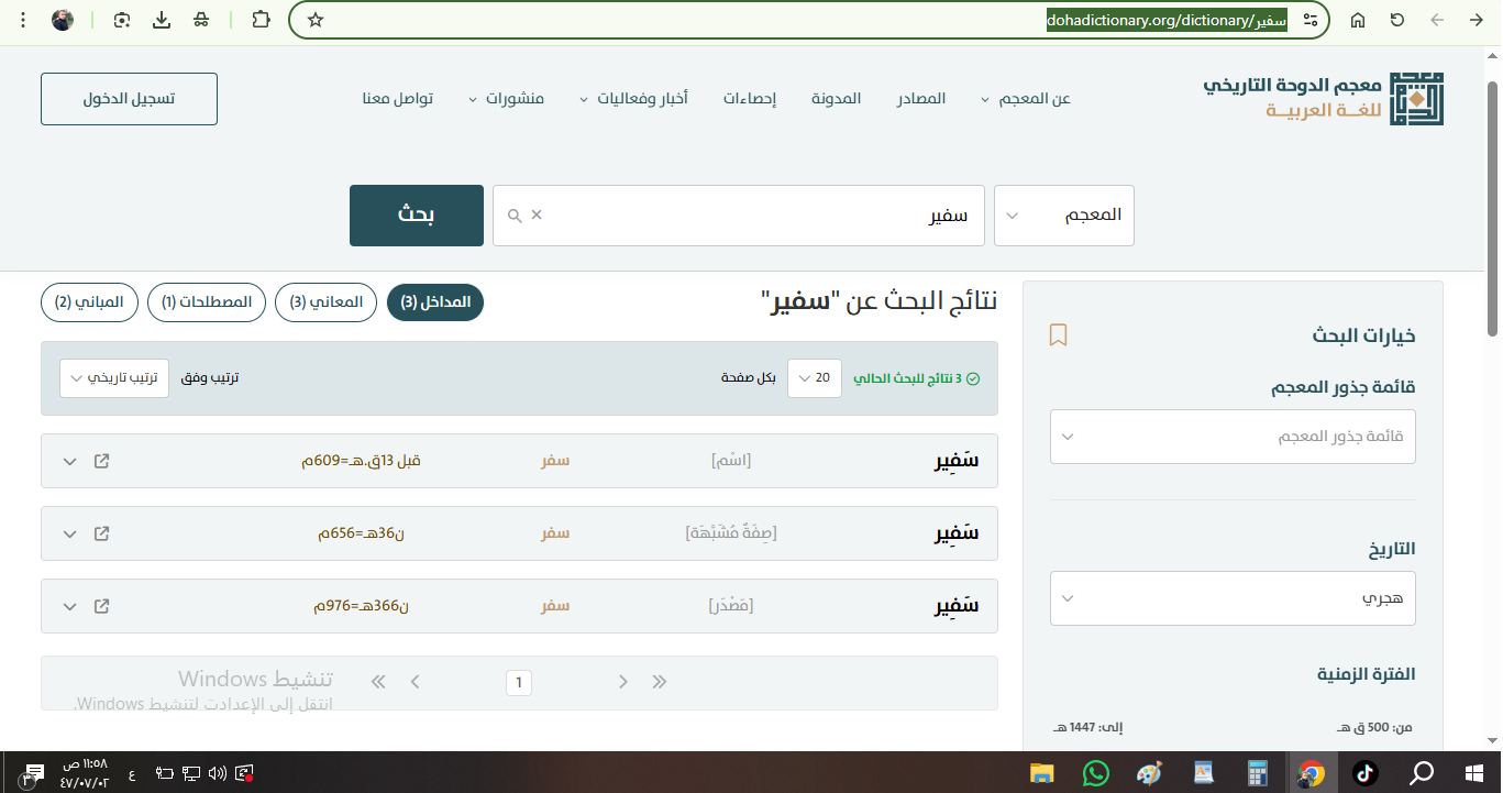 فعند البحث عن أي كلمة في معجم الدوحة التاريخي، مثل كلمة “سفير” على سبيل المثال، من الفترة الزمنية 500 قبل الميلاد وحتى العام 1447 هجري الحالي، لا يعرض المعجم معناها فحسب، بل يفتح أمام القارئ سجلا زمنيا دقيقا يوضح كيف وُلدت الكلمة، وكيف تغيّر معناها عبر أكثر من عشرين قرن غابر، كما تُرتب الشواهد والدلائل ترتيبا تاريخيا من الأقدم إلى الأحدث بالهجري والميلادي أيضاًَ، مع إمكانية البحث بحسب المصدر أو المؤلف أو القائل، مما يسمح بمراقبة التحولات الدلالية بدقة علمية مُتناهية حقيقة الأمر.