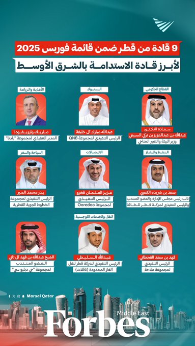 هذه النجاح الكبير يؤكد ويعكس نجاح دولة قطر في ترسيخ مكانتها الإقليمية حول العالم، وذلك عبر شركات قطر ومؤسساتها التي تتبى استراتيجيات مبتكرة في مجالات التمويل الأخضر والاقتصاد الدائري والطاقة المُتجددة، وحضور 9 قادة قطريين ضمن قائمة فوربس الشرق الأوسط 2025، يُعتبر اعترافاً عاليماً بجهود قطر وقادتها في تعزيز التنمية المستدامة، وهو أمر يتماشي مع رؤية قطر الوطنية 2030.